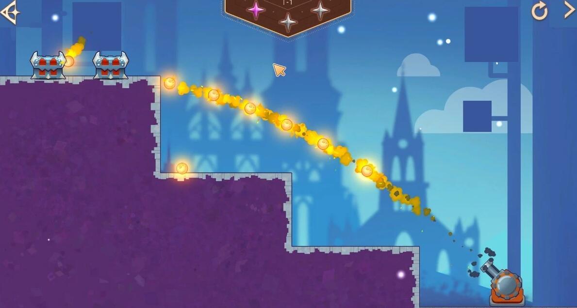 玩家需要用鼠标点击控制火药道具,可以连续发射将眼前的宝箱全部清理!