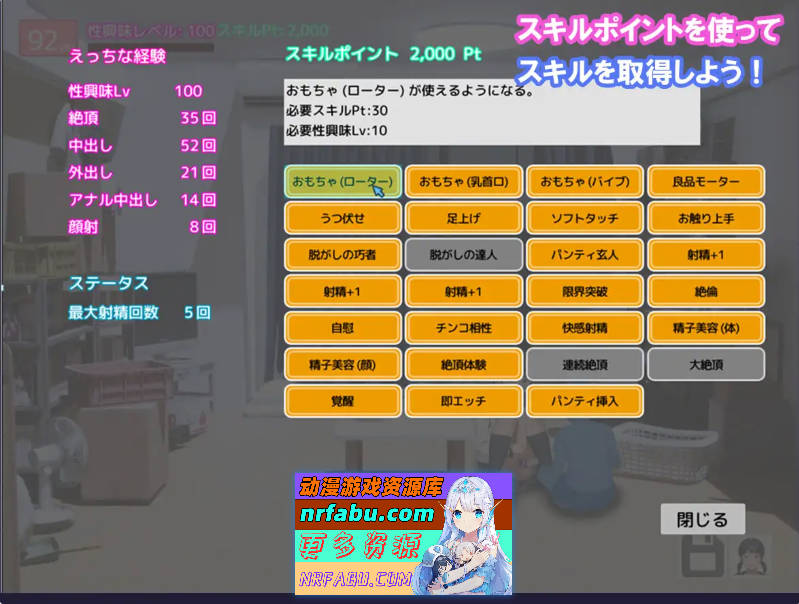 技能包括:改变h中的体位,可以使用大人的玩具等等。